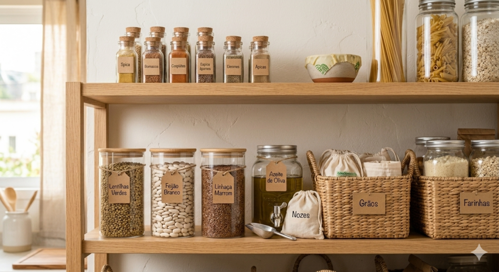 Quer reduzir o plástico? Aprenda como montar uma despensa zero lixo usando potes de vidro, compras a granel e dicas de organização consciente. Confira!